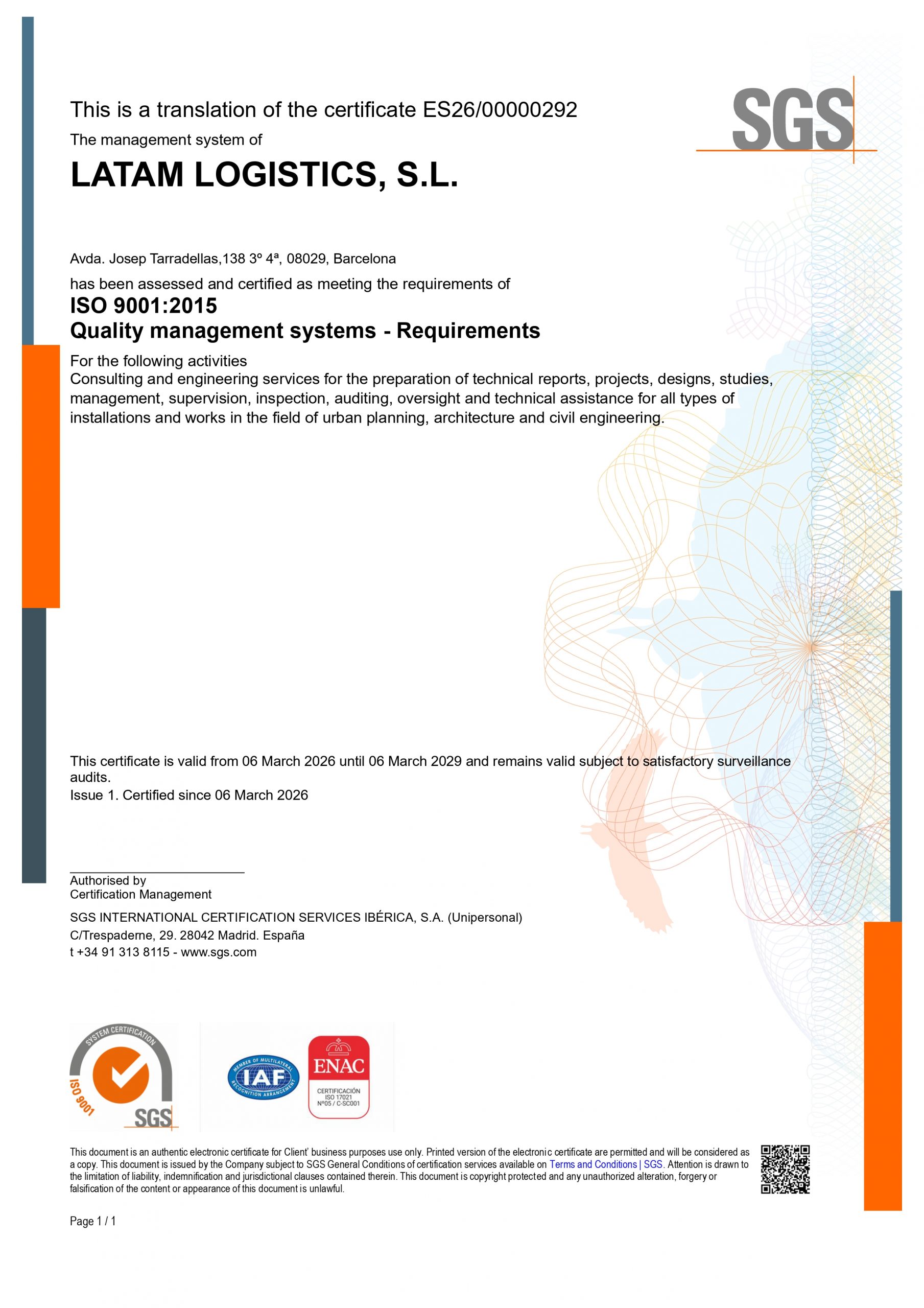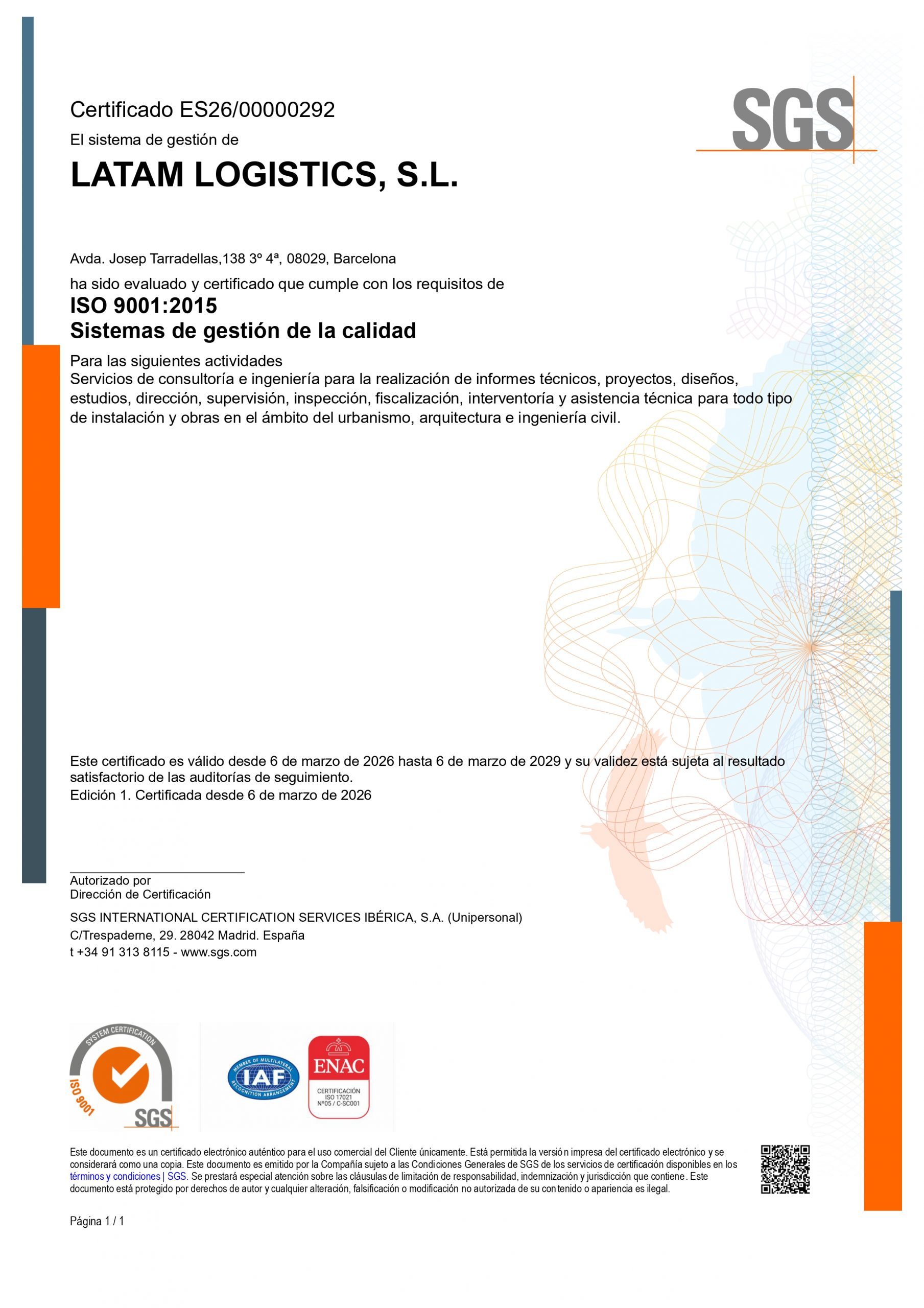LATAM LOGISTICS ha obtenido el certificado ISO 9001:2015 en fecha 06/03/2026 vigente hasta 06/03/2029.